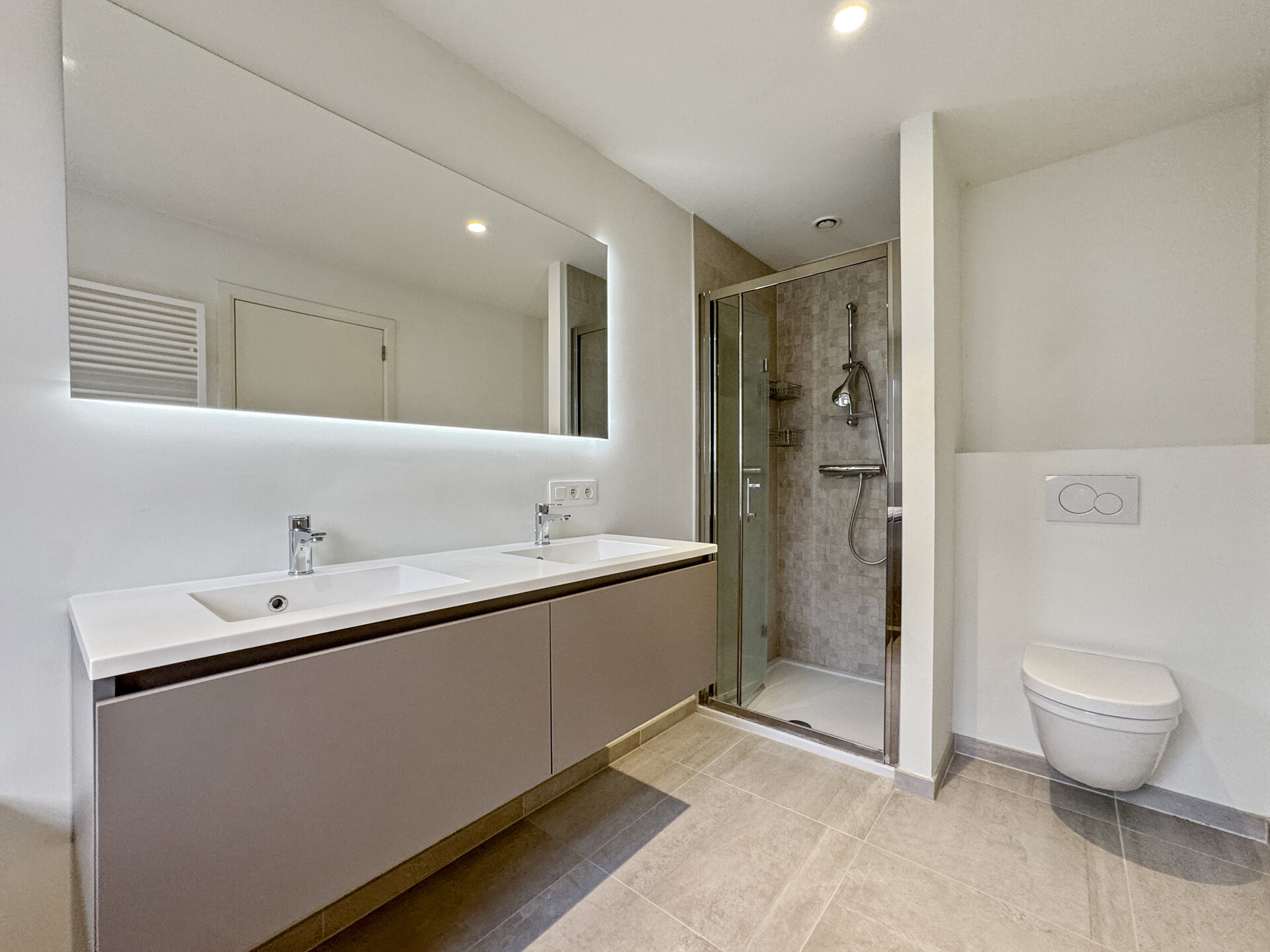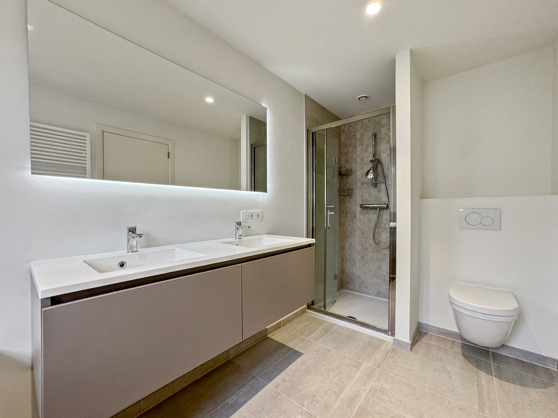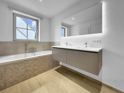 Magnifique ensemble d'appartements situé en plein centre du village d'où l'on peut profiter des nombreux commerces de proximité (boulangerie, banque, boucherie, poissonnerie,...). Les bâtiments construits en 2018 dans un superbe style brabançon, telles de grandes villas, offrent un cadre de vie idéal car il est de petite taille et ne comprend que 2 étages. Les appartements disposent tous d'un ascenseur, de grands espaces extérieurs avec peu de vis-à-vis belles et d'un large parking avec des caves dans les sous-sol. Nous proposons à la location un appartement de deux chambres situé au premier étage. L'appartement dispose d'une superficie totale d'environ 110 mètres carrés dont plus de 40 mètres carrés de séjour ! A l'extérieur une large terrasse couverte de 21 mètres carrés est orientée au sud-ouest. La cuisine, séparée du living et entièrement équipée, possède un bel espace pour installer un coin à déjeuner ce qui est un réel plus pour ce lumineux appartement. Les deux chambres dispose chacune d'une salle d'eau attenante. L'appartement est déjà libre d'occupation !Eigendomsdetails